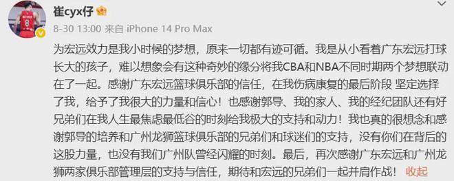 作为继朱芳雨和周鹏之后,广东队又一位顶级国手级别的小前锋,崔永熙还有着NBA经历,可谓是被寄予厚望,甚至不惜直接向竞技状态存在悬念的他提供了四年B类合同,以此绑定双方长期合作。